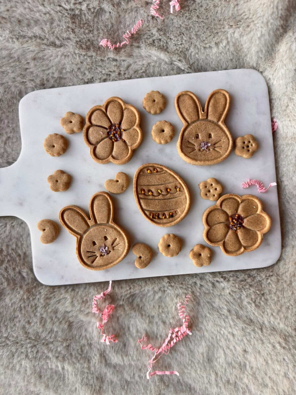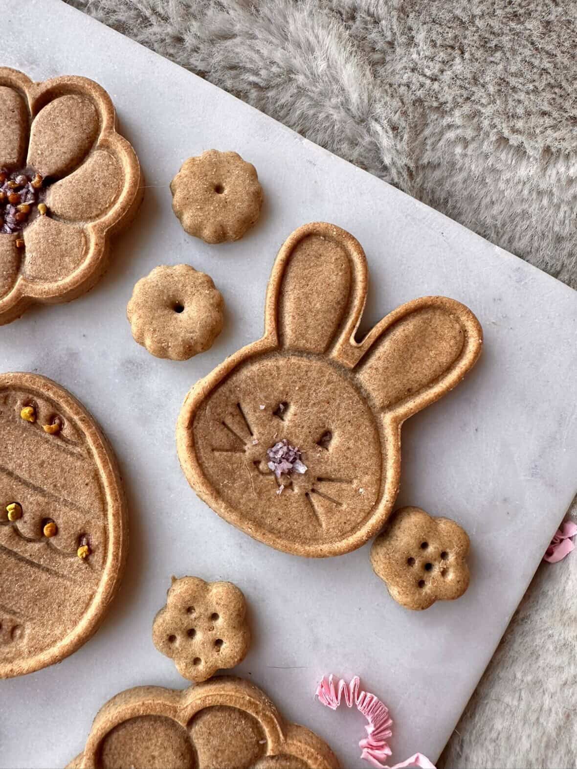Stip een klein beetje Pawfect pindakaas - Aardbei en Pompoen op het koekje en bestrooi met jouw favoriete cooka’s cookies, zoals Cooka's Cookies - Flower Power